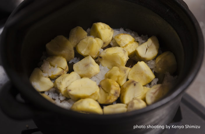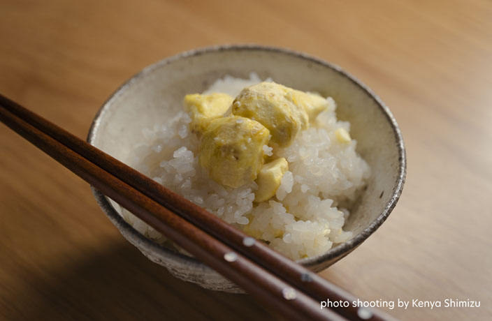- 知り合いからいただいた栗を栗ご飯にして、季節の恵みをありのままにいただきます。丹波の豊かな大地が育んだコシヒカリと丹波栗を、昆布出汁でやさしく炊き上げました。素材の甘みと香りがふわりと広がる、秋ならではの一椀です。丹波の作家・大杉康伸さんの器と、小島紗和子さんの螺鈿箸でいただきます。